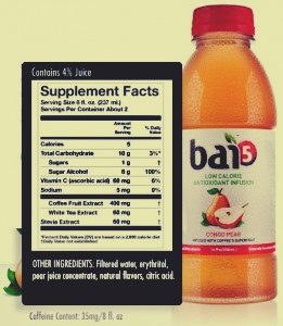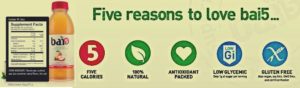 Bai5 is a water beverage that is sweetened and contains just five calories. The company claims that the sweeteners used are all natural and organic and that the beverage is 100 percent completely natural. The word ‘antioxidant’ is printed in bold letters on the front part of the Bai5 bottle.